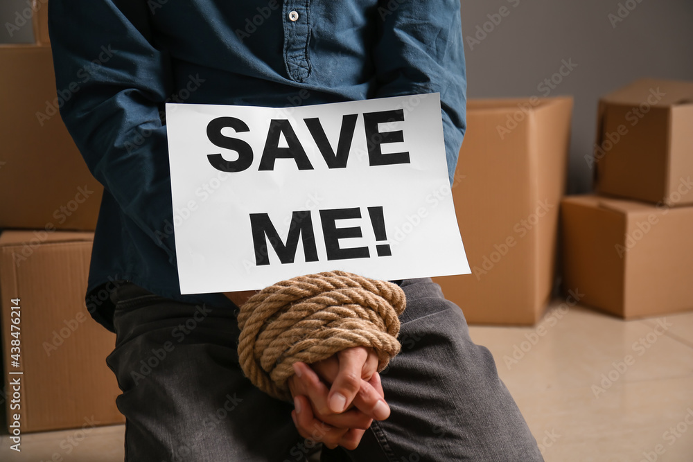 Male Hostage With Text Save Me In Room Stock Photo Adobe Stock